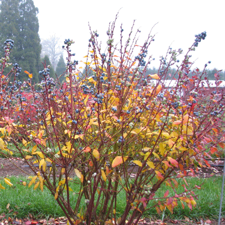 The Perpetua is not only a tasty food source, it doubles as colorful garden landscaping year-round. Each spring and summer crop commences with a profusion of small, white flowers that soon transform into deep, blueberries. The glossy, green leaves provide a rich habitat that burnishes red after the second harvest comes to an end.